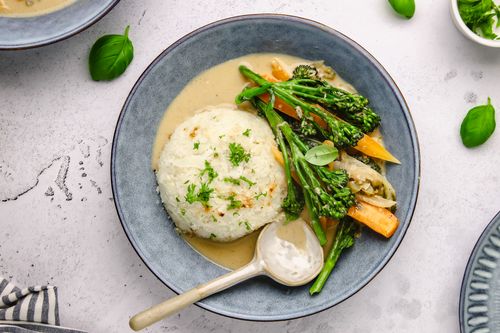 This recipe is for a flavourful Thai green curry with a medley of vegetables, including carrots, Broccolini, and cauliflower rice.