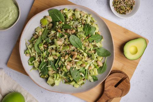 This Supergreen Broccoli and Apple Salad recipe brings it all to your dinner or lunch menu. Crunchy raw broccoli, tart and refreshing Granny Smith apples, crispy cabbage and vibrant green spinach. There's white beans for a protein boost and a sprinkle of seeds for texture, plus a hit of healthy fats from the creamy avocado dressing.